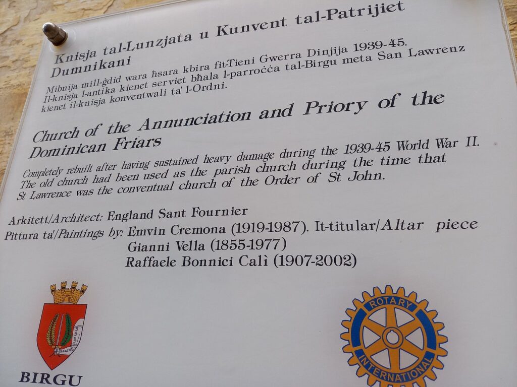 El diseño de la actual Iglesia de la Anunciación (Il-Lunzjata) se atribuye al arquitecto Edwin England Sant Fournier, habiéndose completado su reconstrucción total en 1954. Situada en la calle principal (Triq il-Kbira) de la histórica ciudad de Birgu, esta iglesia es la sede de la Orden de los Dominicos en la zona. El templo original fue terminado en 1575 y se mantuvo como uno de los sitios religiosos más importantes durante la estancia de los Caballeros en Birgu; sin embargo, la estructura histórica fue destruida casi por completo por los intensos bombardeos aéreos durante la Segunda Guerra Mundial en 1941.