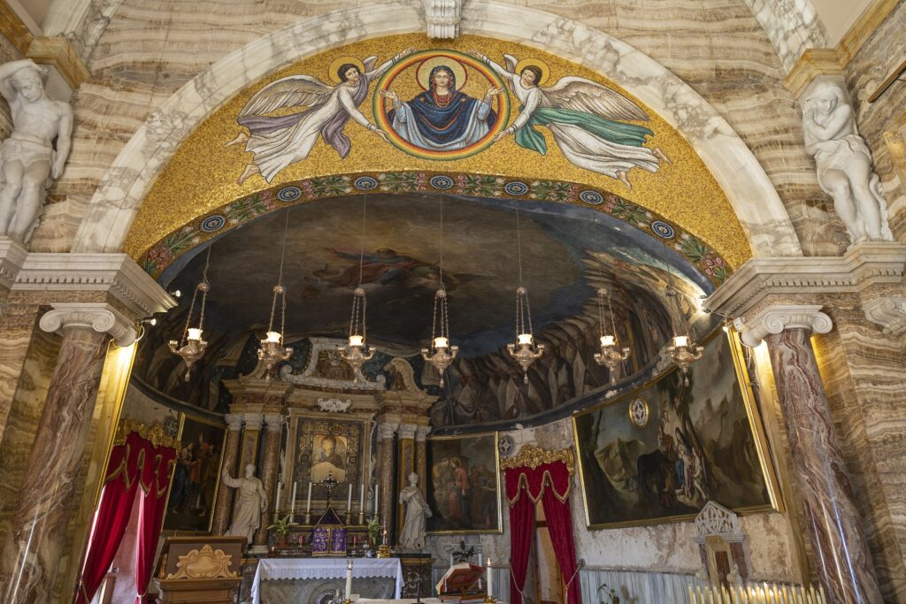 La pintura titular, realizada directamente sobre la roca en estilo bizantino siciliano y datada entre finales del siglo XII y comienzos del XIII, representa a la Virgen con el Niño Jesús y lleva las inscripciones MAT y DEI, que significan Madre de Dios. Según la tradición, habría sido pintada por San Lucas durante el viaje de San Pablo a Roma en el año 60 después de Cristo. En 1644 Mario De Vasi de Siracusa promovió la ornamentación del altar mayor con un frontal y elementos escultóricos en piedra.
