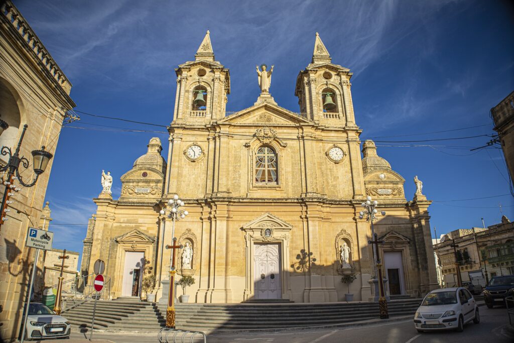 The Parish Church of Żurrieq is a cornerstone of Maltese heritage, notable for its three-bay, two-level façade crowned by a triangular pediment featuring a statue of Christ the King, created by Marco Montebello based on a design by Vincenzo Apap. Its bell towers, supported by Corinthian pilasters, house six bells and are adorned with delicate floral motifs. A unique architectural feature is its dome, inherited from the original 17th-century church; this structure represents a transitional phase toward the style of Lorenzo Gafà, rising on an octagonal drum with elongated windows that flood the presbytery with light.