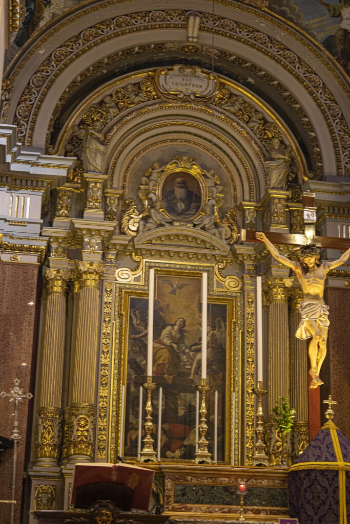 The undisputed jewel of the church is its titular painting, The Martyrdom of Saint Catherinepainted around 1671 by the renowned artist Mattia Preti. The work captures the moment when the Holy Spirit descends upon the saint as an angel frees her from her chains atop a broken spiked wheel, with the executioners defeated at its base. Thanks to a project co-financed by the European Union, critical interventions have been carried out to halt water infiltration and dome deterioration, as well as to install an efficient LED lighting system that highlights the building’s beauty while ensuring its long-term structural preservation.