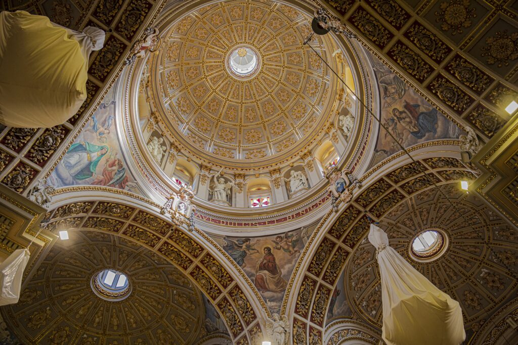 The interior of the church is a display of art and symbolism. In 1970, the painter Rafel Bonnici Calì decorated the pendentives of the crossing with representations of the cardinal virtues (Martyrdom, Virginity, Fortitude, and Wisdom). Additionally, the drum of the dome is embellished with eight niches that contain stone statues of the Beatitudes, carved by Alfred Camilleri Cauchi with the assistance of Angelo Agius. The space is completed by three low saucer domes that crown the transepts and the choir, creating a spatial harmony characteristic of the mature Baroque of the island.