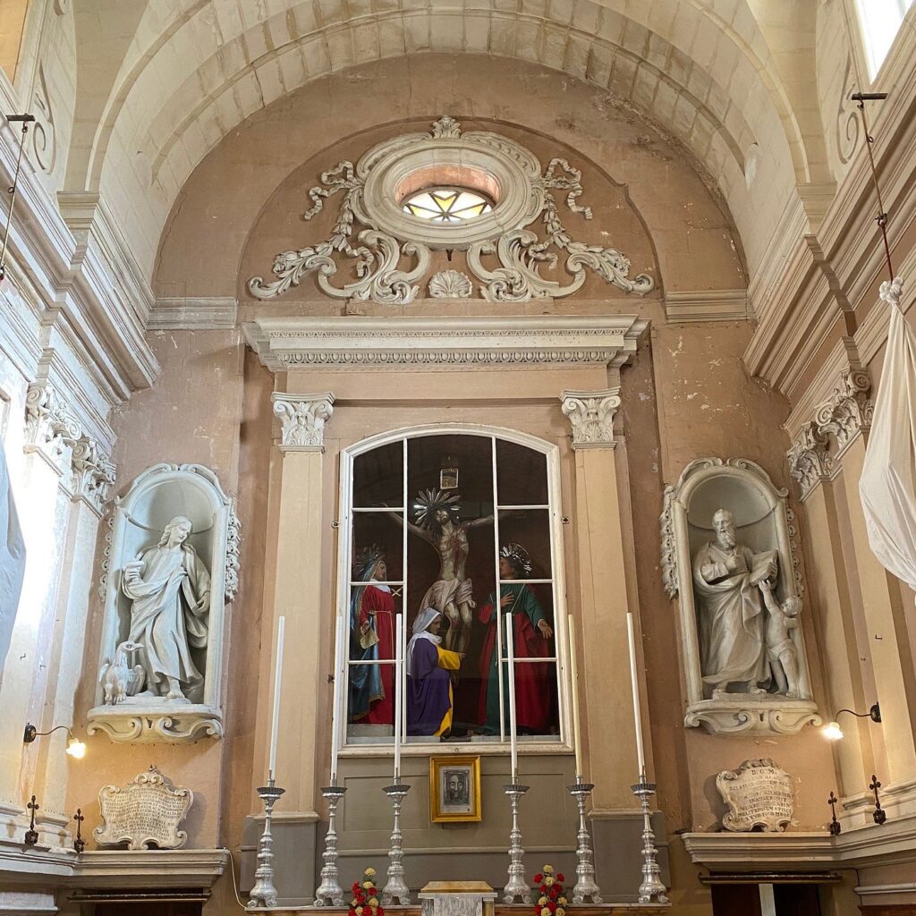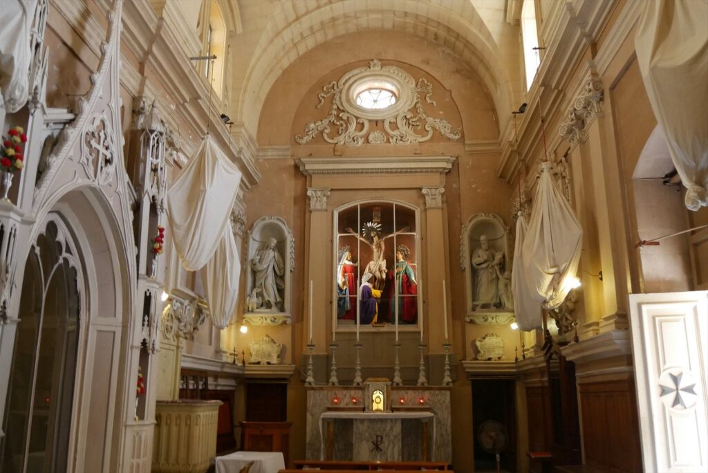 El interior de la iglesia destaca por su sencillez decorativa y su atmósfera de oración profunda. El elemento central es su altar mayor, que alberga una representación de la Santa Cruz, símbolo de la redención y eje central de la devoción de la comunidad. A diferencia de otras iglesias de Birgu, aquí no encontrarás frescos recargados ni dorados excesivos; en su lugar, la calidez de la piedra desnuda y la luz natural crean un espacio de serenidad absoluta. Bajo el suelo del templo se encuentran criptas donde descansan muchos de los frailes que dedicaron su vida al servicio de Birgu, añadiendo una capa de historia y solemnidad al lugar.