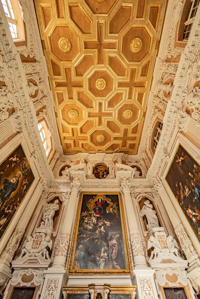La riqueza escultórica de la capilla es obra de la familia Casanova, quienes en la década de 1650 decoraron el espacio con figuras de cuerpo entero de santos como San Joaquín, San Juan Bautista y San Pablo, además de bustos de los fundadores jesuitas, San Ignacio de Loyola y San Francisco Javier. El altar principal está presidido por la pintura titular de la “Asunción de la Virgen María”, una obra maestra al óleo de Stefano Erardi que captura el asombro de los apóstoles ante la tumba vacía mientras María es elevada al cielo. Esta escena se completa con una pintura superior de la Santísima Trinidad, preparada para la coronación de la Virgen.