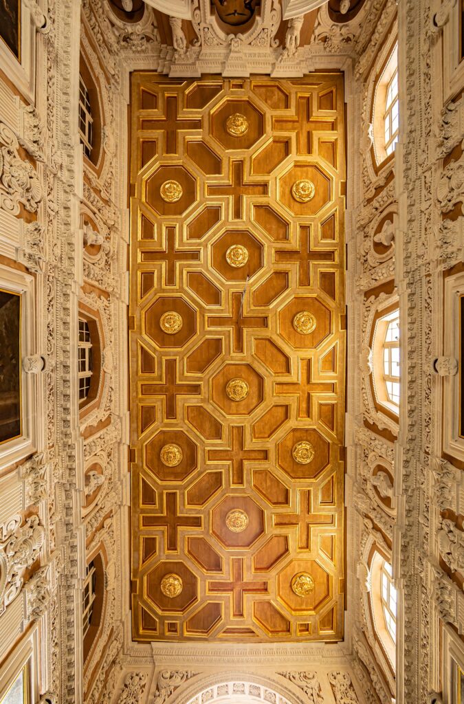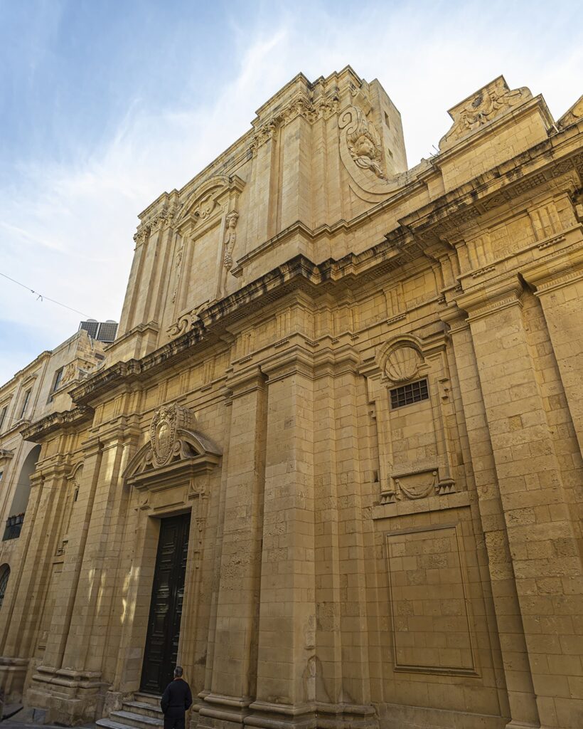 La Iglesia de los Jesuitas, también conocida por su advocación a la Circuncisión de Cristo, es uno de los monumentos barrocos más importantes de la capital maltesa. Aunque su construcción comenzó bajo las órdenes de Giuseppe Valeriano, fue el arquitecto Francesco Buonamici quien, tras 1637, elevó el templo a su máximo esplendor, introduciendo elementos decorativos innovadores en su fachada como volutas invertidas con serafines y cabezas de querubines entre follaje de piedra. Dentro de este complejo destaca el Oratorio de los Onorati, famoso por su impresionante techo de madera artesonado con paneles hexagonales y rosetas doradas, sostenido por una histórica estructura de vigas importadas que ha sido cuidadosamente mantenida desde la época de la Orden de San Juan.