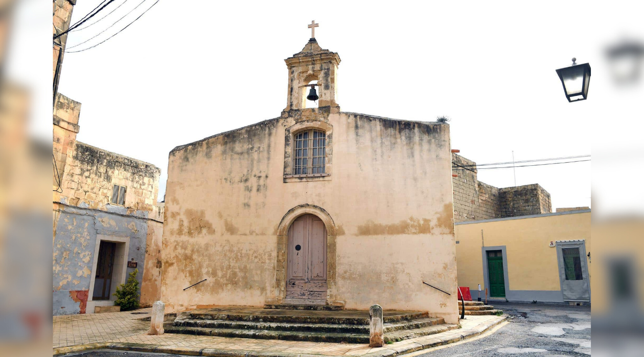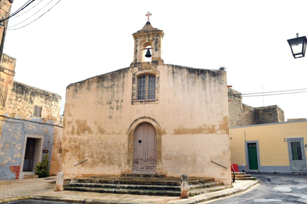 Esta histórica capilla destaca por una arquitectura sencilla y austera, característica de las estructuras religiosas rurales de Malta. Su fachada, despojada de ornamentación compleja, presenta una puerta central con arco de medio punto y una gran ventana superior que actúa como la principal fuente de luz para el altar mayor. El diseño se completa con un tejado inclinado, evocando las antiguas capillas medievales, y un pequeño campanario central que sostiene una única campana. El conjunto está precedido por un parvis elevado, rodeado por una escalera que facilita el acceso al templo.