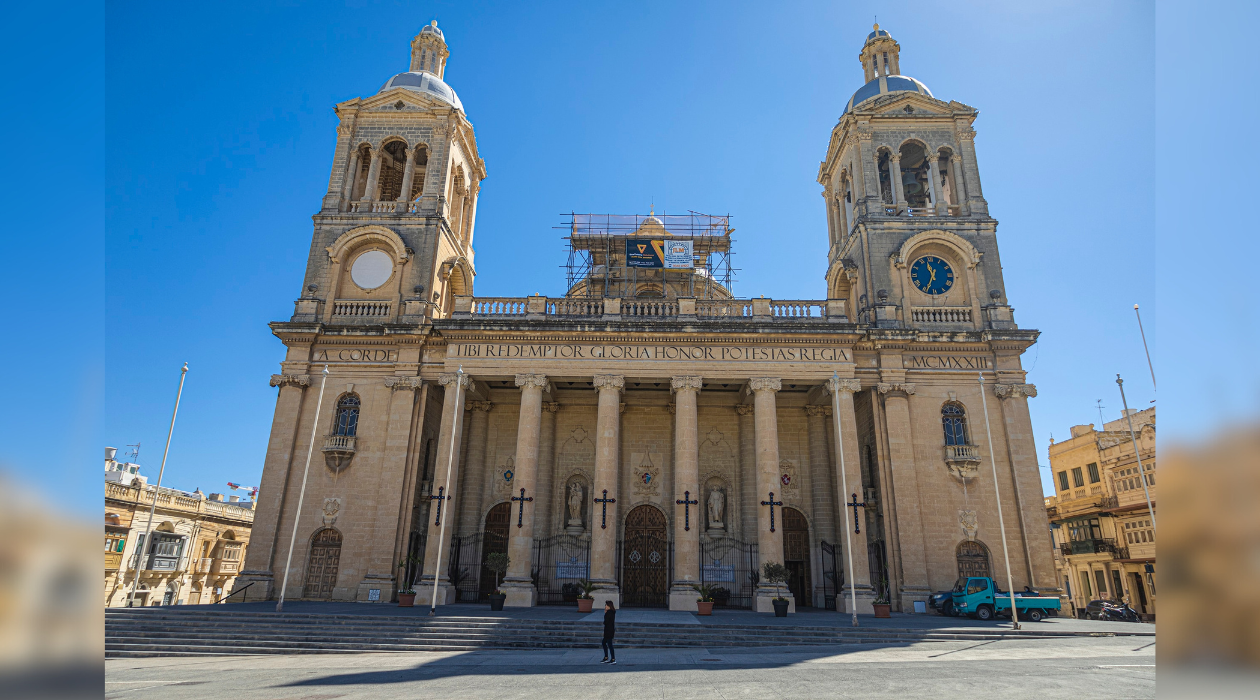 La Basílica de Cristo Rey es una de las estructuras religiosas más imponentes de Malta, caracterizada por su monumental pórtico de 30 metros de ancho sostenido por seis columnas de orden jónico moderno. La fachada, de una simetría rigurosa, alberga estatuas de San José y la Virgen María, esculpidas en 1926 por Antonio Zammit. A los lados se elevan dos campanarios de 50 metros de altura divididos en tres secciones neoclásicas, cuyas agujas en forma de cúpula coronan el paisaje urbano. Un detalle arquitectónico fascinante son las diecinueve cúpulas menores que recorren el tejado, definiendo visualmente las naves laterales a lo largo de su extensa nave central.