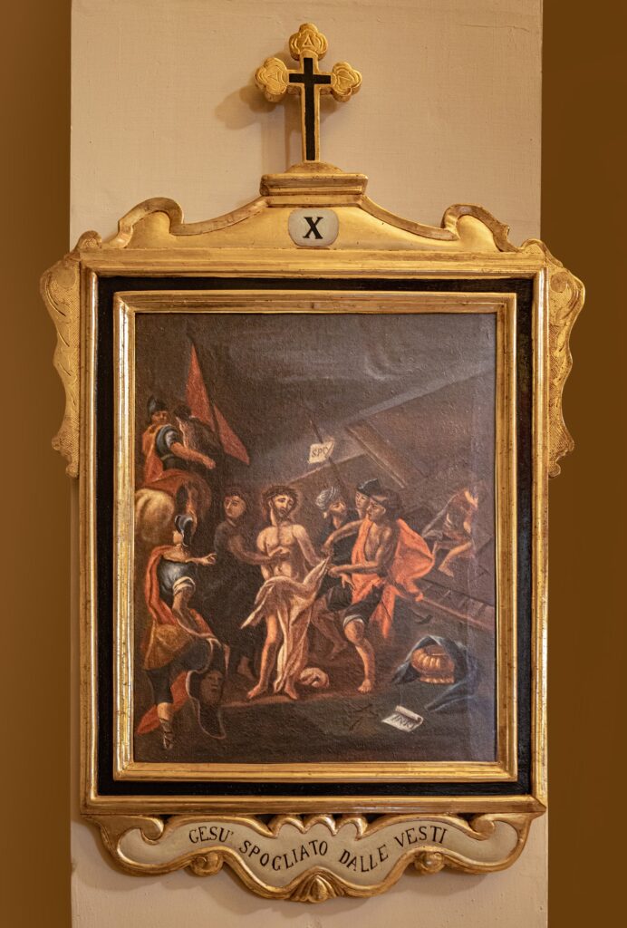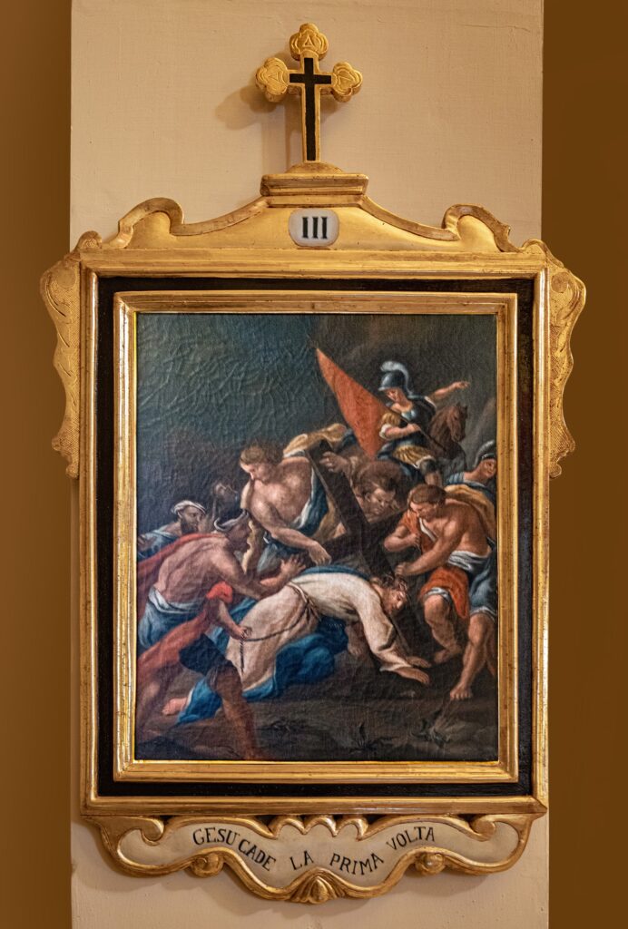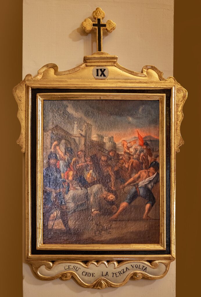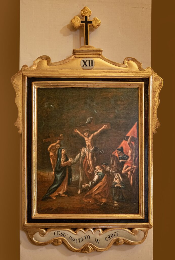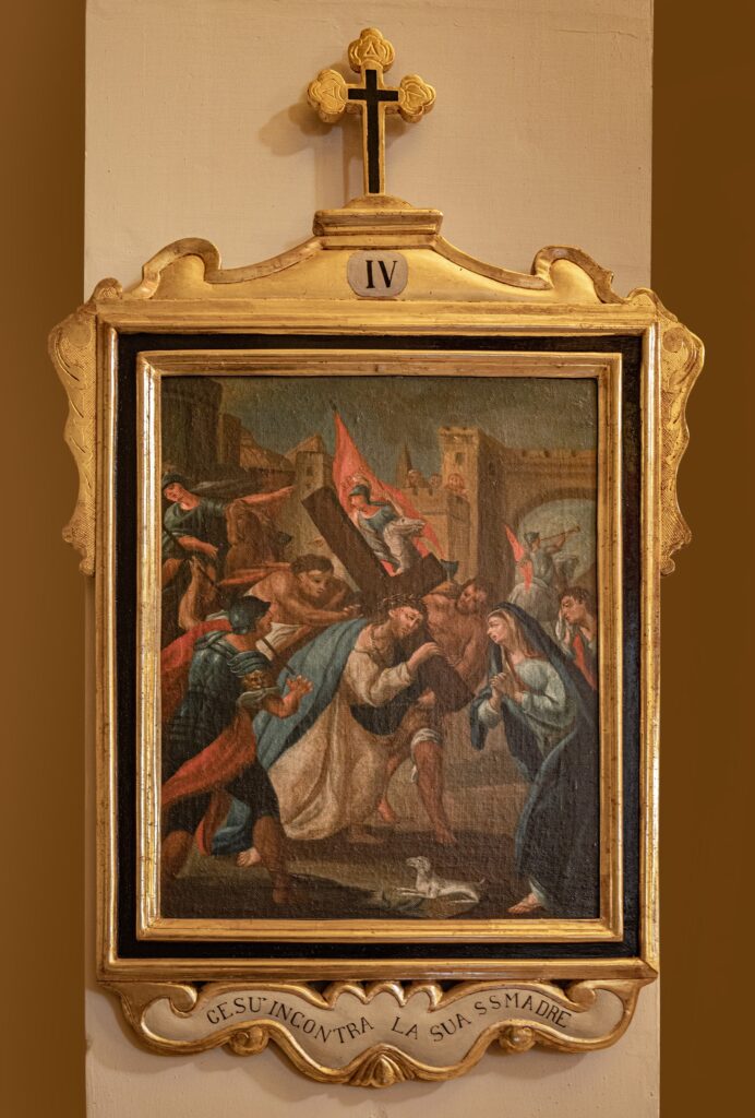 El patrimonio pictórico incluye un Vía Crucis del siglo XVIII compuesto por trece pinturas barrocas tardías que representan escenas como Cristo cayendo bajo la cruz, el encuentro con María y Santa Verónica, la Crucifixión y el Entierro. También destacan las obras dedicadas a la Virgen María: el retablo de Nuestra Señora del Rosario —con la Virgen y el Niño acompañados por santo Domingo y santa Catalina de Siena—; la “Adoración de los Magos”, con Jaspe, Baltasar y Melchor ofreciendo oro, incienso y mirra; y el óleo barroco del siglo XVII sobre los Desposorios de la Virgen y San José. El nicho de Nuestra Señora del Rosario, pintado al óleo sobre piedra, presenta paneles monocromáticos con detalles dorados, mientras que su pedestal de madera dorada luce volutas barrocas y el monograma “MV” enmarcado en un óvalo decorativo.