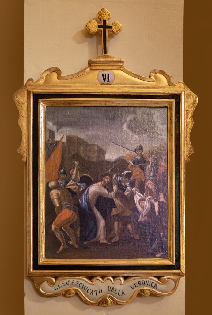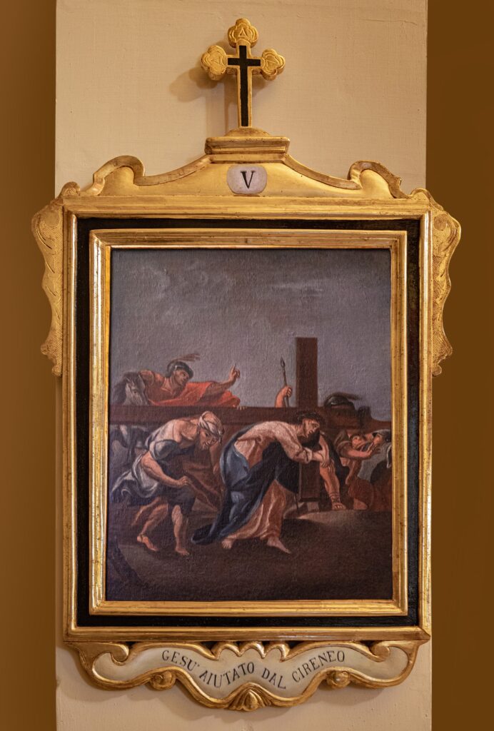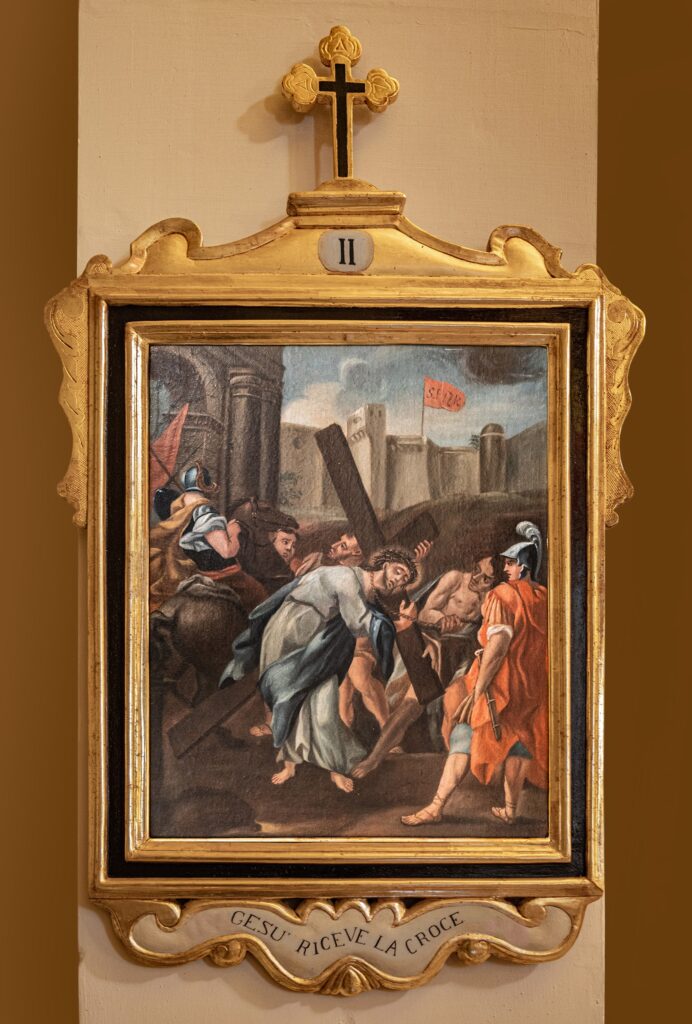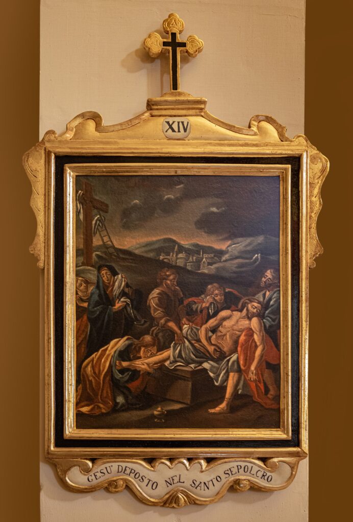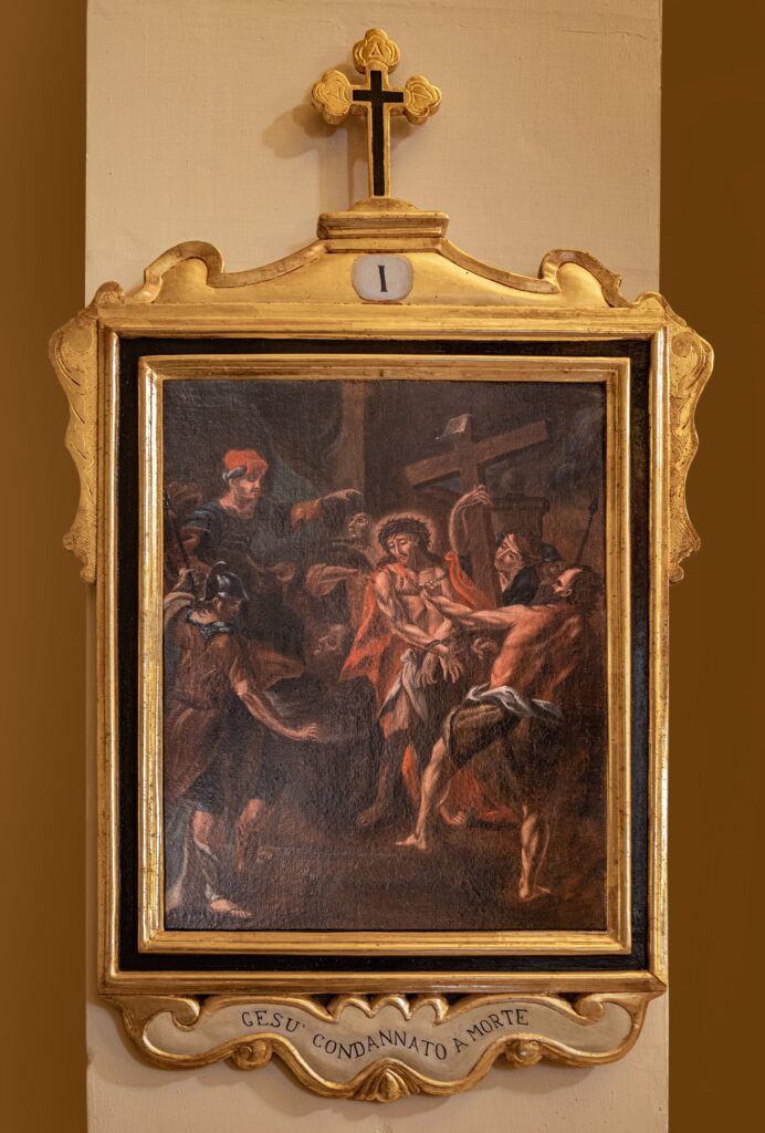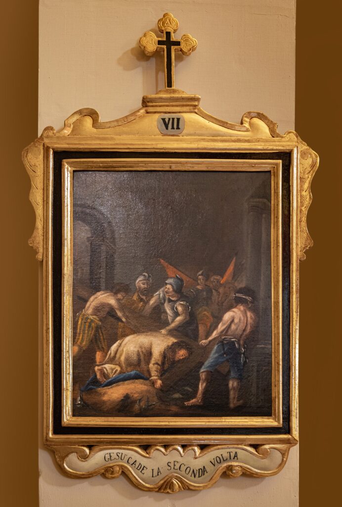 El patrimonio pictórico incluye un Vía Crucis del siglo XVIII compuesto por trece pinturas barrocas tardías que representan escenas como Cristo cayendo bajo la cruz, el encuentro con María y Santa Verónica, la Crucifixión y el Entierro. También destacan las obras dedicadas a la Virgen María: el retablo de Nuestra Señora del Rosario —con la Virgen y el Niño acompañados por santo Domingo y santa Catalina de Siena—; la “Adoración de los Magos”, con Jaspe, Baltasar y Melchor ofreciendo oro, incienso y mirra; y el óleo barroco del siglo XVII sobre los Desposorios de la Virgen y San José. El nicho de Nuestra Señora del Rosario, pintado al óleo sobre piedra, presenta paneles monocromáticos con detalles dorados, mientras que su pedestal de madera dorada luce volutas barrocas y el monograma “MV” enmarcado en un óvalo decorativo.