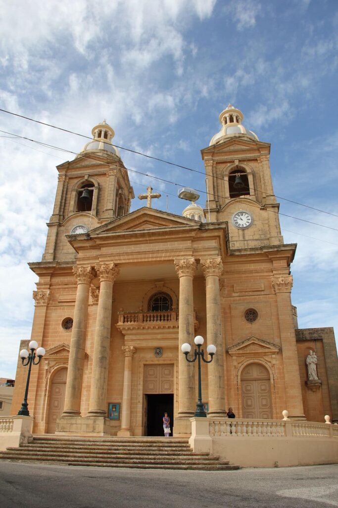 La fachada se distingue por un imponente pórtico sostenido por dos pares de columnas corintias sobre plintos, coronado por un frontón triangular. Sobre la puerta principal se alzan un balcón con balaustrada y una ventana semicircular. Las puertas laterales, también rematadas por frontones triangulares y pequeñas ventanas redondas, conducen directamente a la nave. El conjunto se abre a un atrio ovalado. Los dos campanarios están coronados por pequeñas cúpulas con linterna: el del sur alberga tres campanas fundidas en 1990 por la firma italiana Achille Mazzola (Valduggia), llamadas «Santa María», «El Salvador» y «San José»; el campanario conocido como «tal-arlogg» conserva las campanas históricas, incluida la mayor, fundida por Giulio Cauchi en 1880.
