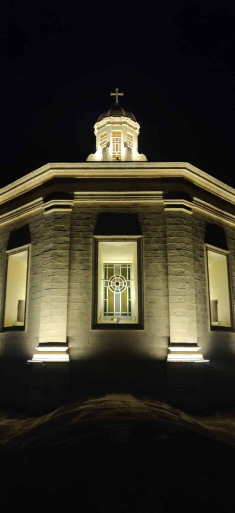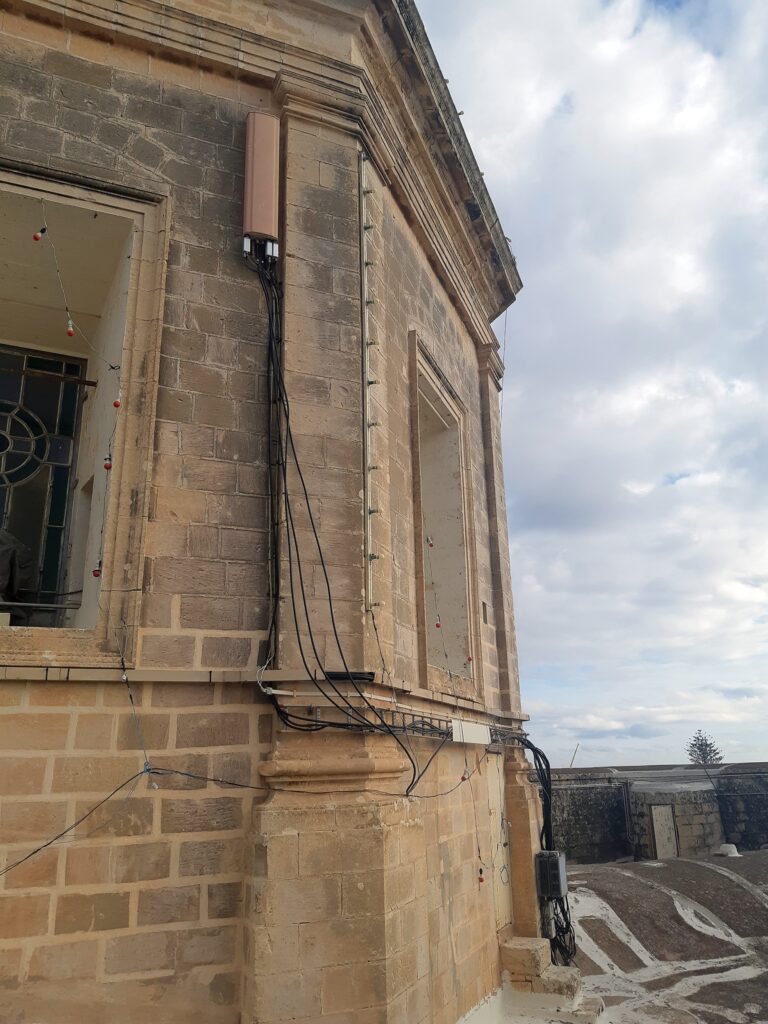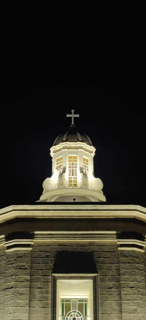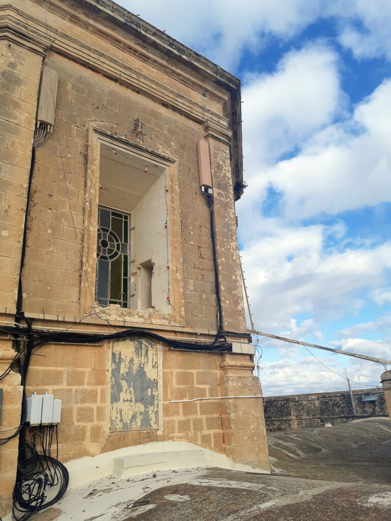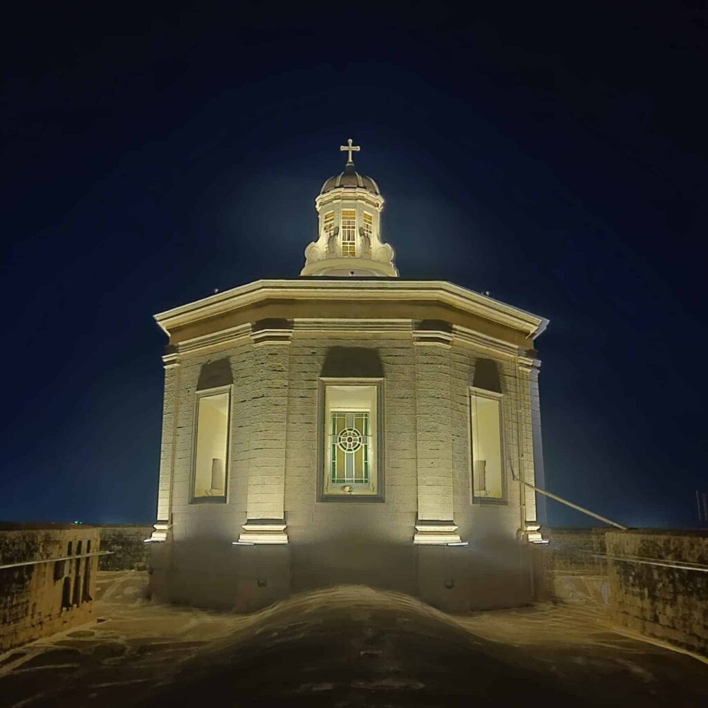 La iglesia de San Felipe de Agira destaca por su planta cruciforme y una fachada dividida simétricamente en tres crujías, coronada por dos de los campanarios más antiguos de la isla, que datan de 1655. Su diseño arquitectónico se completa con una cúpula octogonal sobre el crucero, adornada con contrafuertes de volutas, y un portal principal que luce un refinado balcón con balaustrada. En sus torres, el tiempo es custodiado por un reloj fabricado en 1882 por el maestro maltés Michelangelo Sapiano, junto a un conjunto de siete campanas cuya pieza más antigua se remonta a 1658.